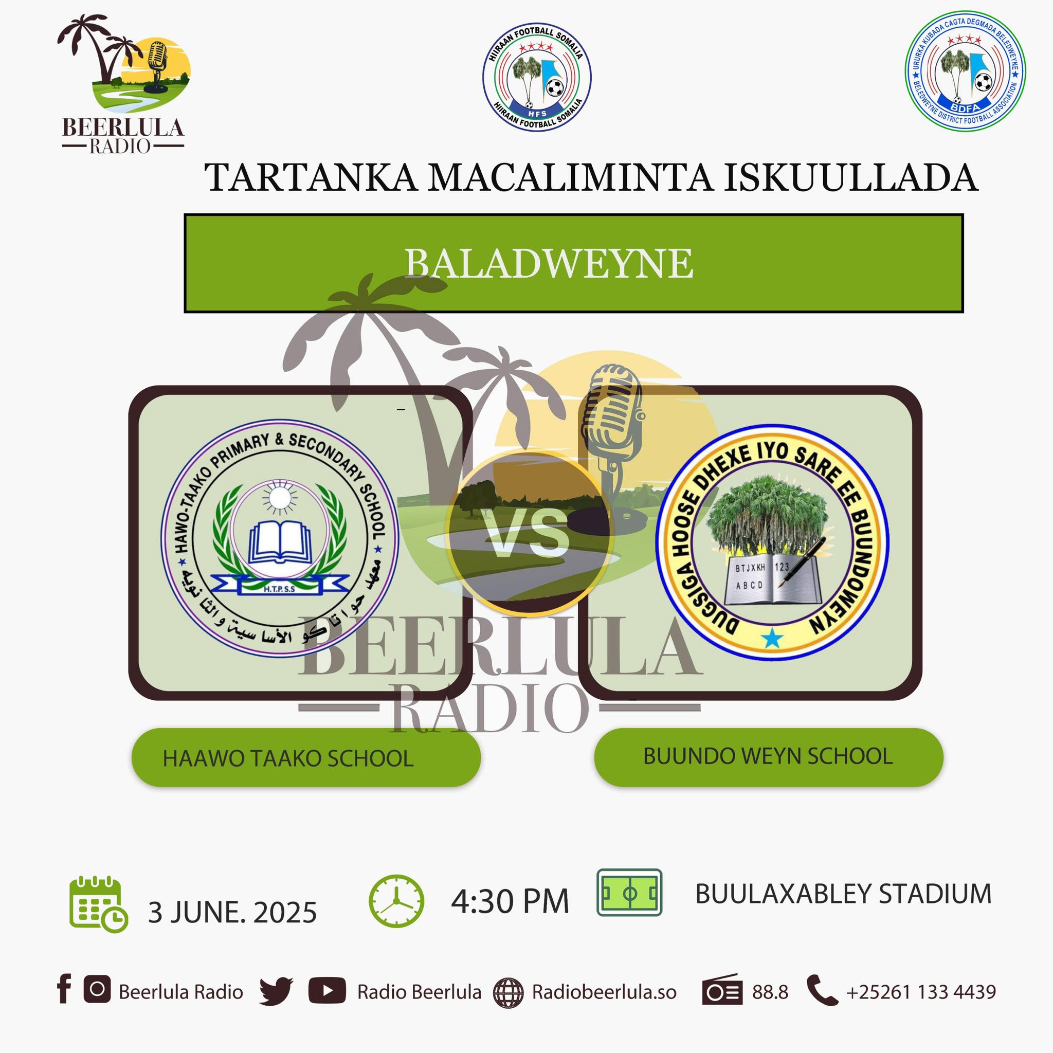 Baladweyne ( Radio Beerlula )-Kooxaha kala matalaya Xaawo Taako School Vs Buundo weyn SchooLย  ayaa galabta fooda isku dari doono garoonka Buula-Xaableey ee tartanka Macalimmiinta Dugsiyada ku yaalo Baladweyne.