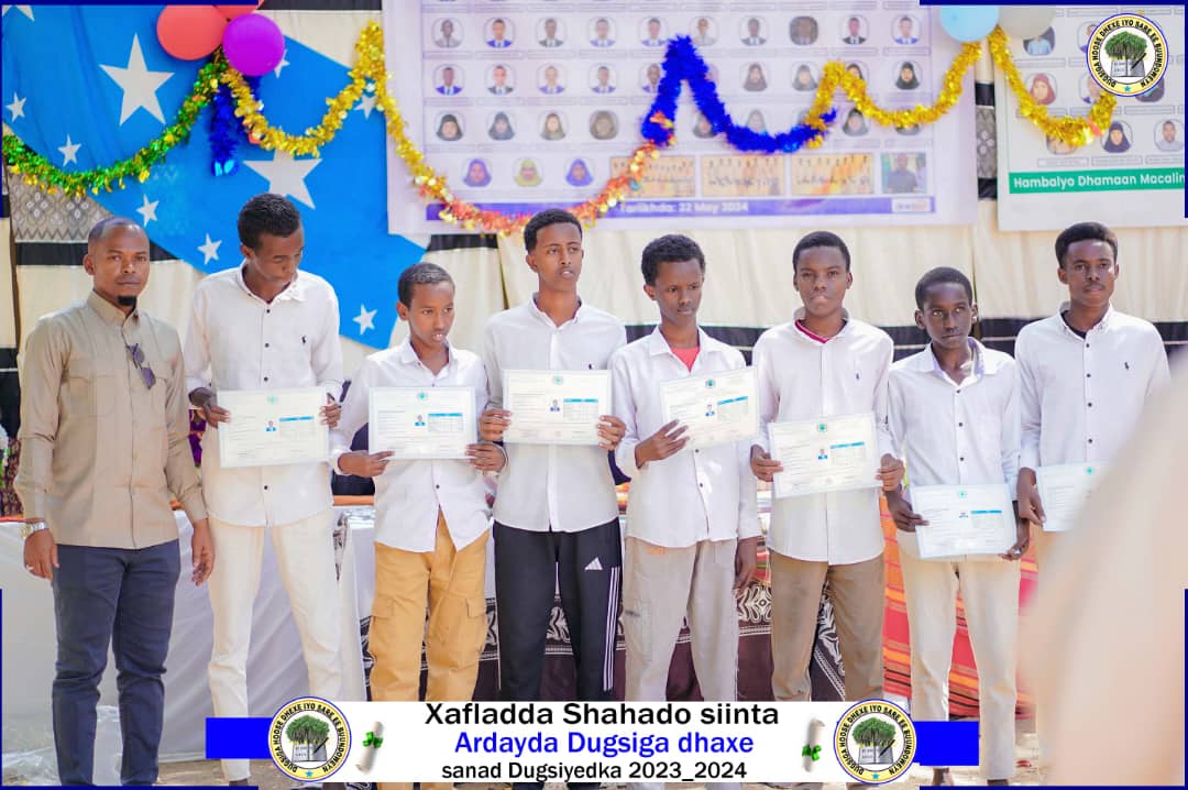 Baledweyne ( Radio Beerlula )-Maamulka Dugsiga Hoose Dhexe sare ee Buundo-weeyn ayaa maanta magaalada Baladweyne ku qabtay munaasabad abaalmarino iyo shahaadooyiin lagu gudoonsiinayay Ardaydii ka baxday Dugsiga Dhexe ee sanad Dugsiyeedka 2023-2024.