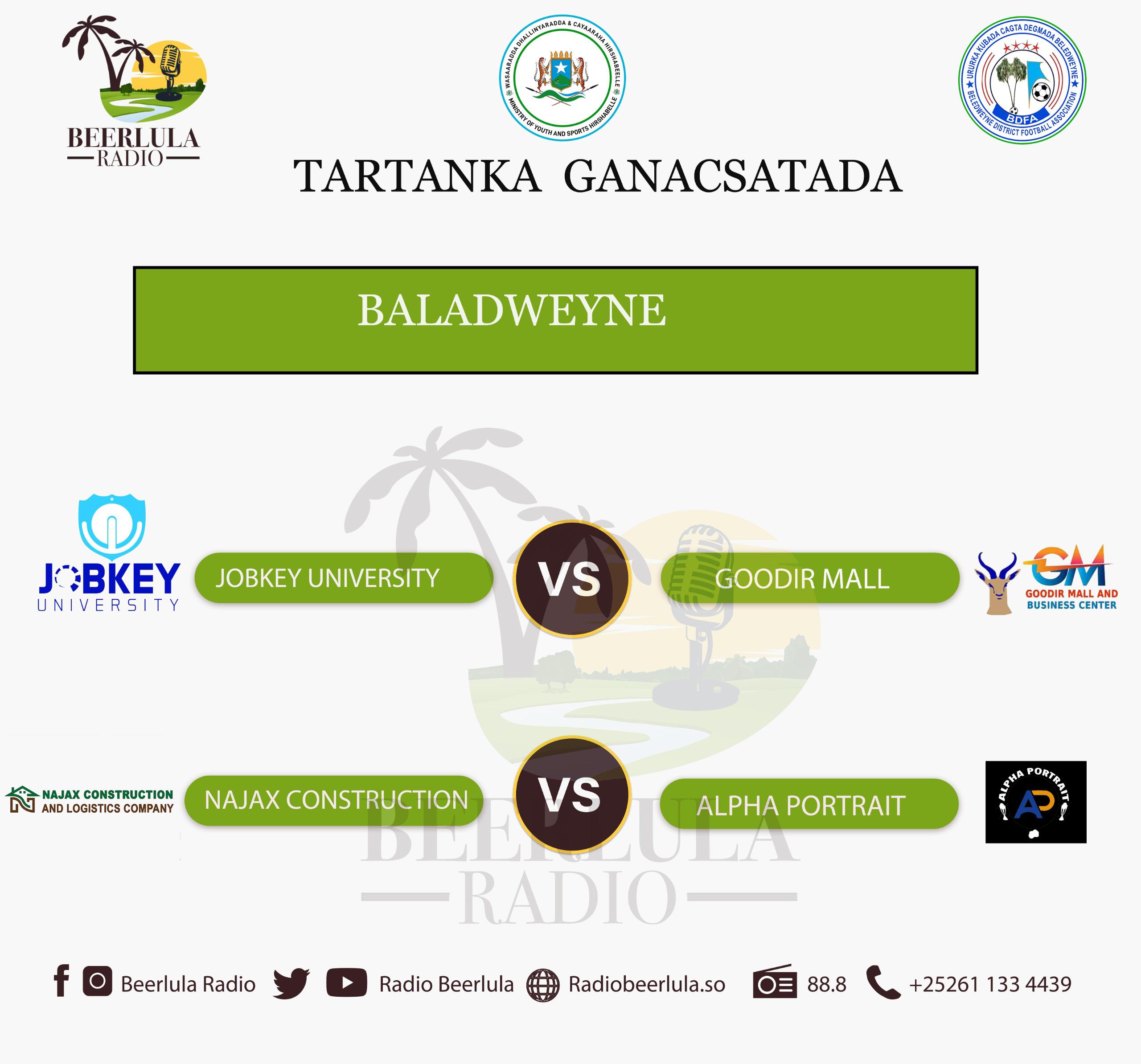 Baladweyne ( Radio Beerlula )- Guddiga tartanka kubadda cagta goobaha ganacsi, waxbarashadda iyo caafimaadka magaalada Baladweyne ayaa shaaciyay isku aadka sami finalka tartankan oo ay iskugu soo hareen afar kooxood.