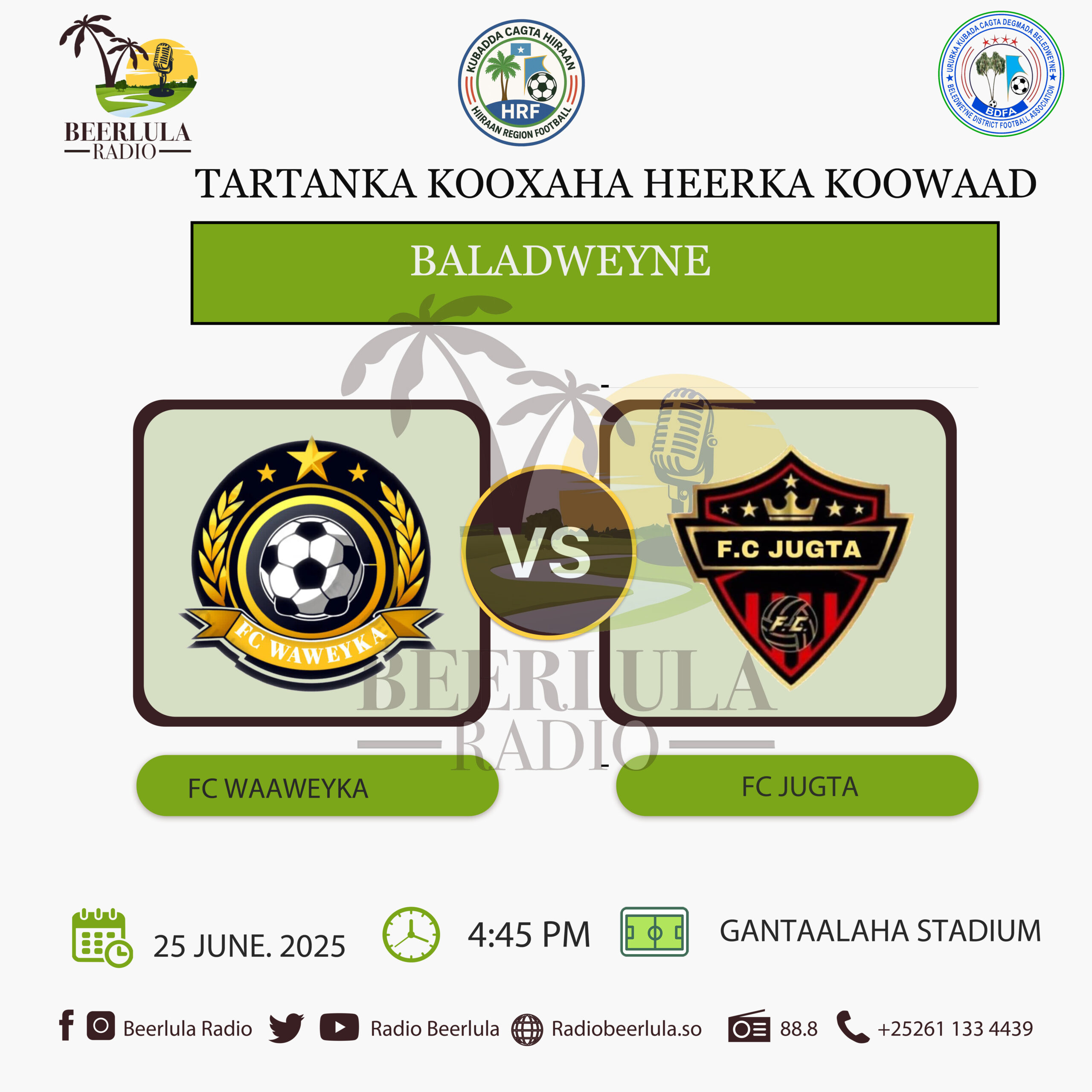 Baladweyne(Radio Beerlula)- Kooxaha kubadda cagta Waaweyka iyo Jugta ayaa galabta fooda isku dari doona garoonka kubadda cagta Gantaalaha ee xaafadda Buundoweyn ee magaalada Baladweyne.