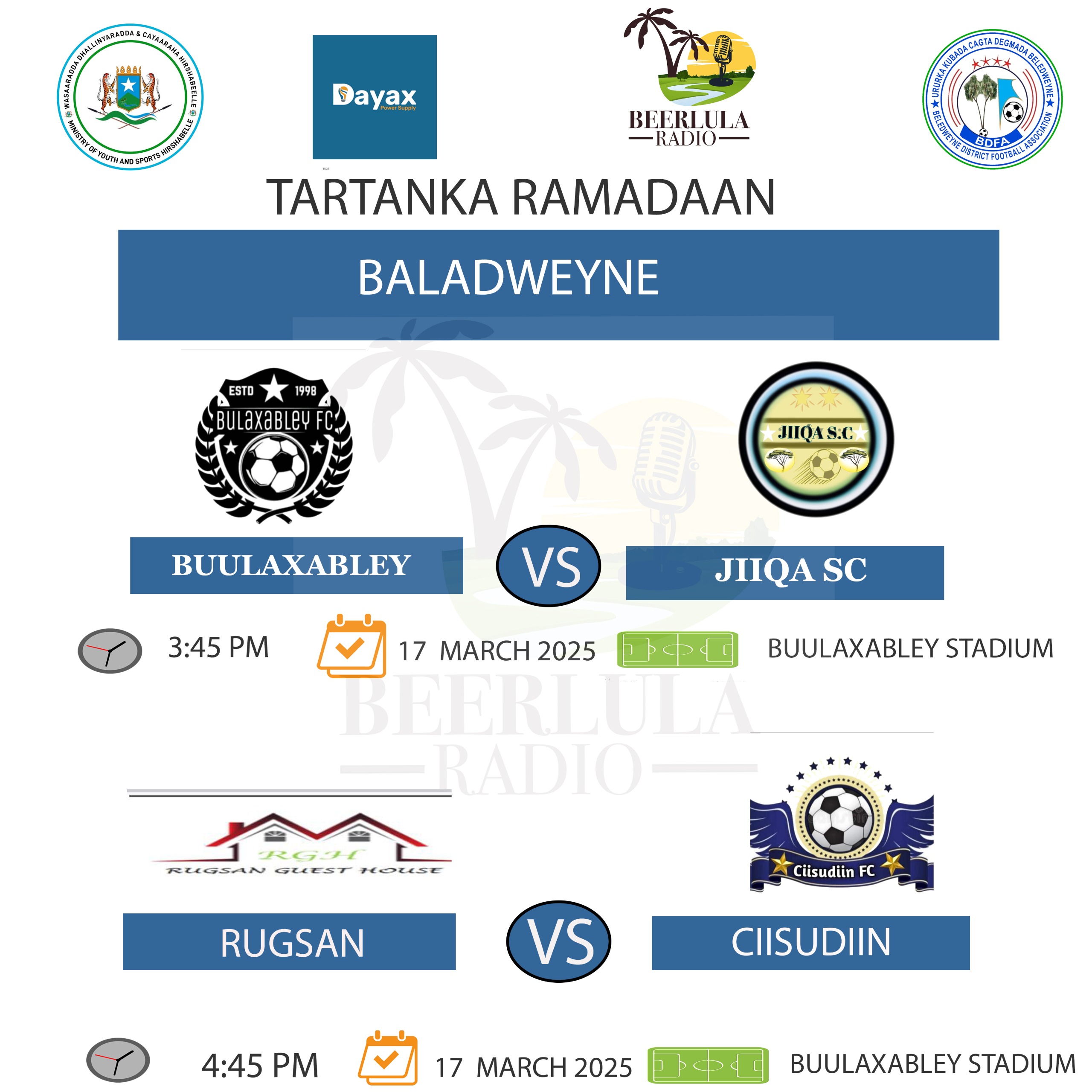 Baledweyne ( Radio Beerlula )-Baledweyne ( Radio Beerlula )-Laba kulan oo xiiso badan ayaa galabta ka jira garoonka kubadda cagta Buulaxabley ee magaalada Baladweyne oo uu ka socdo tartanka bisha barakeysan ee Ramadaan.