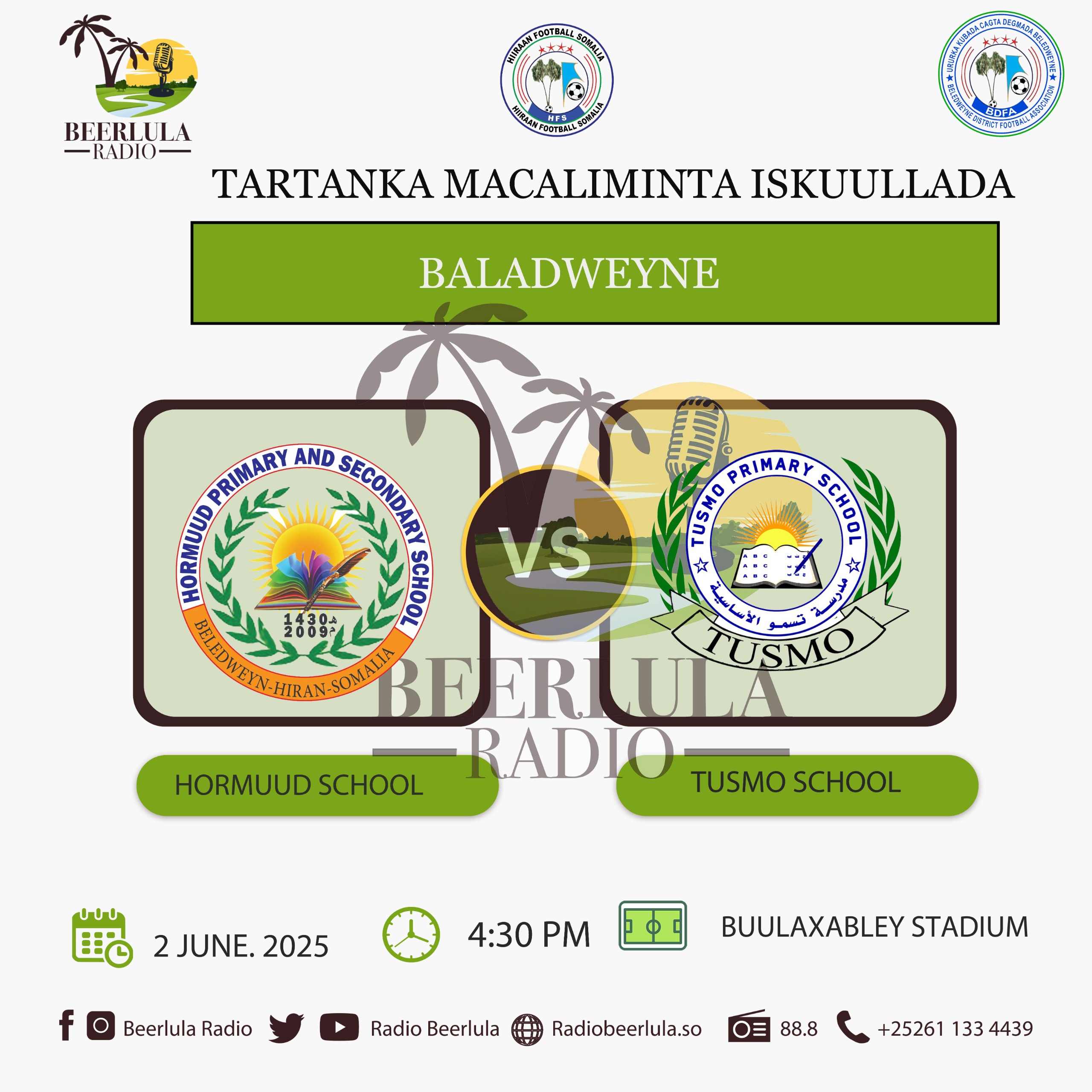 Baladweyne ( Radio Beerlula )-Kooxaha kala matalaya iskuulada Hormuud School VS Tusmo School ayaa galabta fooda isku dari doono garoonka Buula-Xaableey ee tartanka Macalimmiinta Dugsiyada ku yaalo Baladweyne.