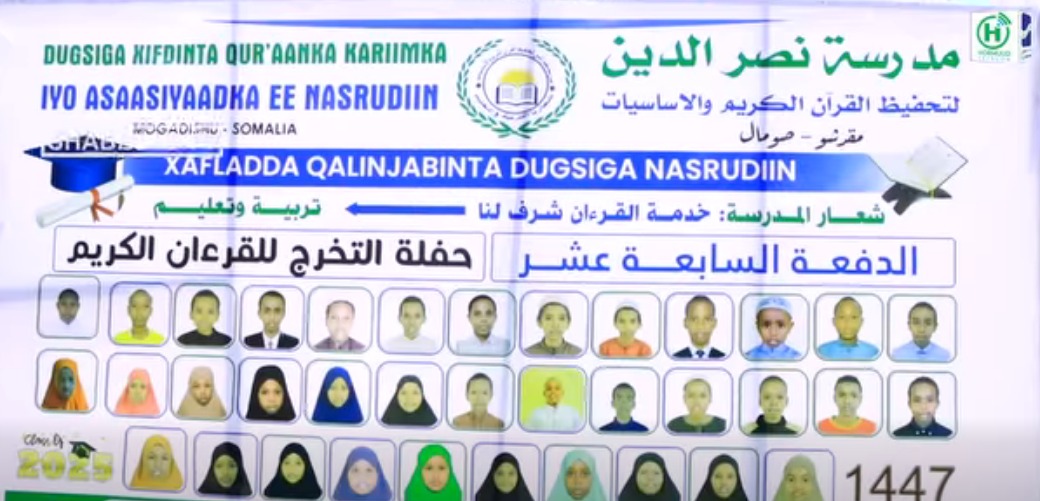 Baledweyne ( Radio Beerlula )-Magaalada Muqdisho ee caasimadda Dalkeena Soomaaliya ayaa lagu qabtay Munaasabad ay ku qalin jabinaayeen inkabadan 100 arday oo baratay Xifdinta iyo Tafsiiska Qur’aanka kariimka iyo Akhris qoraalka Luuqada carabiga islamarkaana ka aflaxday Madarasada Nasrul-Diin.