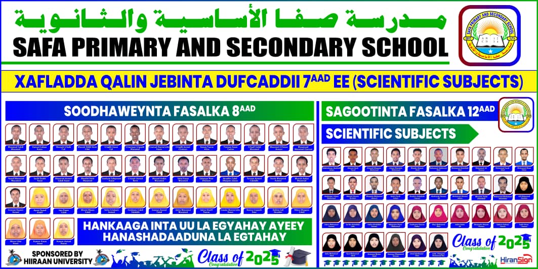 Baladweyne ( Radio Beerlula )-Magaalada Baladweyne ee xarunta Gobalka Hiiraan ayaa lagu qabtay munaasabad ay ku qalin jabinayeen inkabadan 100 ardayda oo isugu kuwoo dhameeysatay fasalka 8aad iyo Cilmiga Sayniska Islmarkaana ka aflaxday Dugsiga Hoose Dhexe Sare Safa.