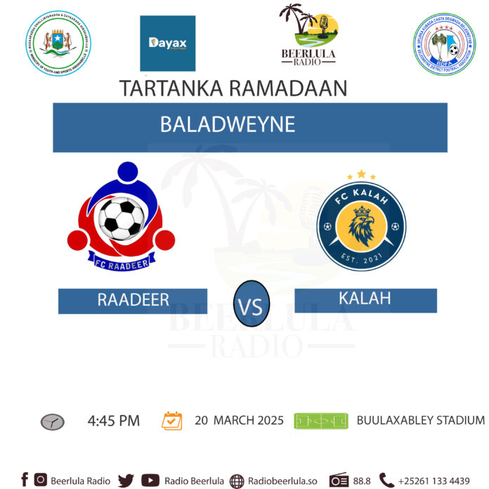 Baladweyne (Radio Beerlula)- Kulan xiiso badan oo u dhexeeya kooxaha Raadeer iyo Kalah ayaa galabta 4:45 PM ku dhaxmari doona garoonka kubadda cagta Buulaxaabley, iyadoona labadan kooxood mid kood ay soo bixi doonto.
