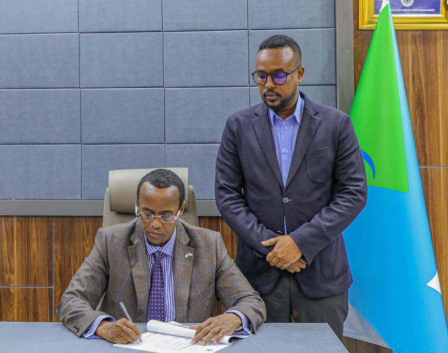 Baladweyne ( Radio Beerlula )-Madaxweynaha Dowladda Hirshabeelle Mudane Cali Cabdullaahi Xuseen (Cali Guudlaawe) ayaa maanta xafiiskiisa waxa uu ku saxiixay Hindise Sharciyeedka Shatiyada iyo Sumadaha Ganacsiga iyo Warshaddaha.