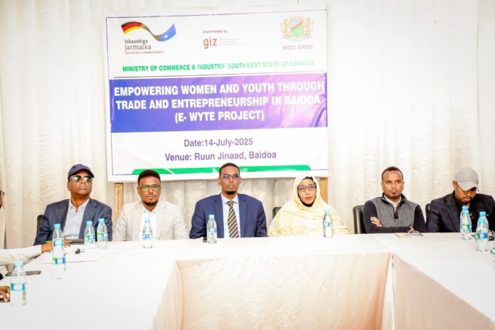 Baledweyne ( Radio Beerlula )-Wasiirka Wasaaradda Ganacsiga iyo Warshadaha Dowladda Koonfur Galbeed Mudane Cabdulaahi Abdi Mohamed ayaa magaalada Baydhabo kafuray shir ballaaran oo lagu dhiirrigelinayo haweenka iyo ragga ku jira ganacsiyada yaryar iyo kuwa dhexe.