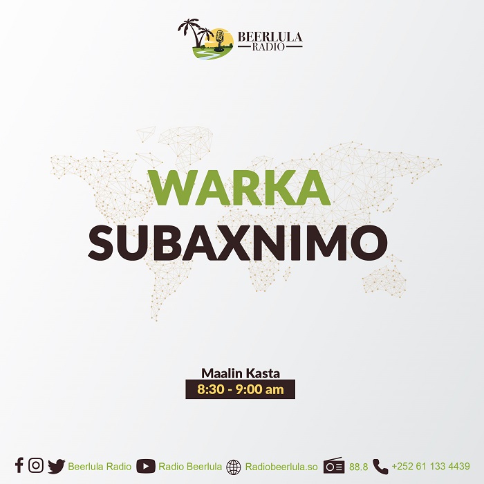 Wararka Warka Subaxnimo ee Radio Beerlula By Radio Beerlula - May 10, 2025 0 158 FacebookTwitterPinterestWhatsApp Baledweyne ( Radio Beerlula )- dhamaan dhageystayaasha iyo akhristayaasha Radio Beerlula waxaan halkan idinku soo gudbineynaa Warka Subaxnimo ee Radio Beerlula, waxaa soo jeedinaya Cabduqaadir Cumar Ibraahim. Share this: Click to share on Facebook (Opens in new window) Facebook Click to share on X (Opens in new window) X