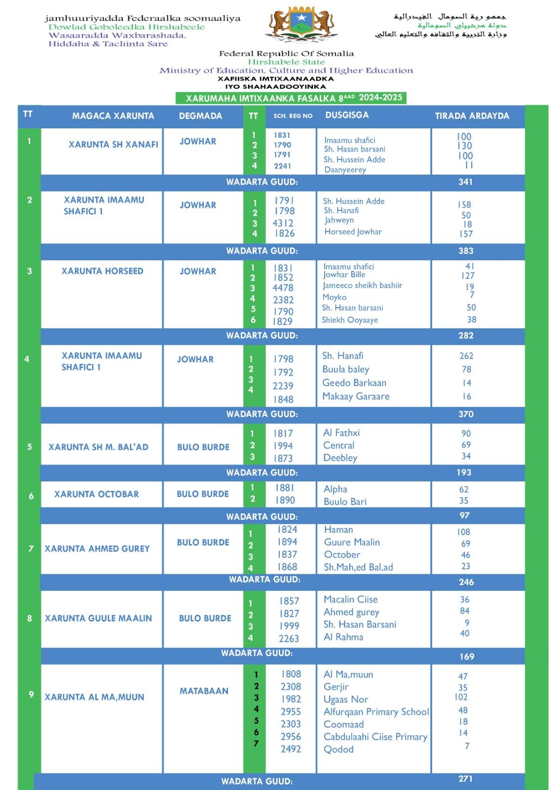 Baledweyne ( Radio Beerlula )-Wasaaradda Waxbarashada, Hiddaha iyo Tacliinta Sare ee Dowladda Hirshabeelle ayaa si rasmi ah u shaacisay xarumaha rasmiga ah ee lagu galayo imtixaanka fasalka 8aad ee sanad dugsiyeedka 2024–2025.