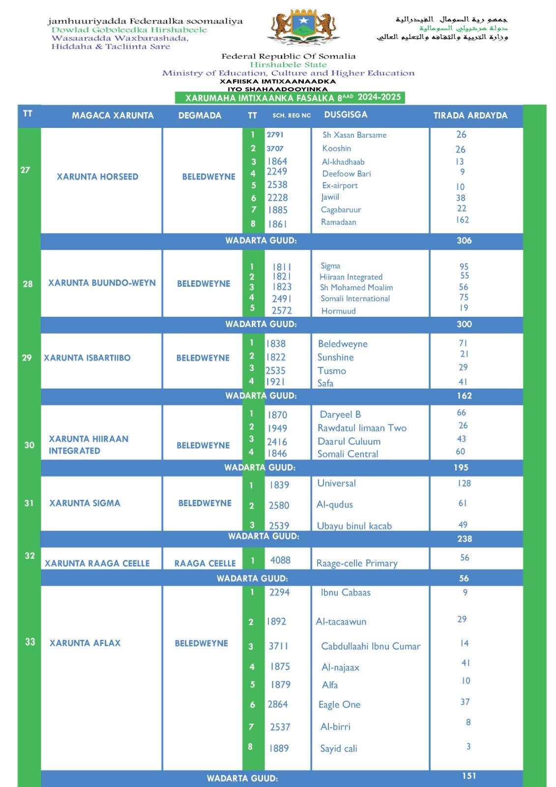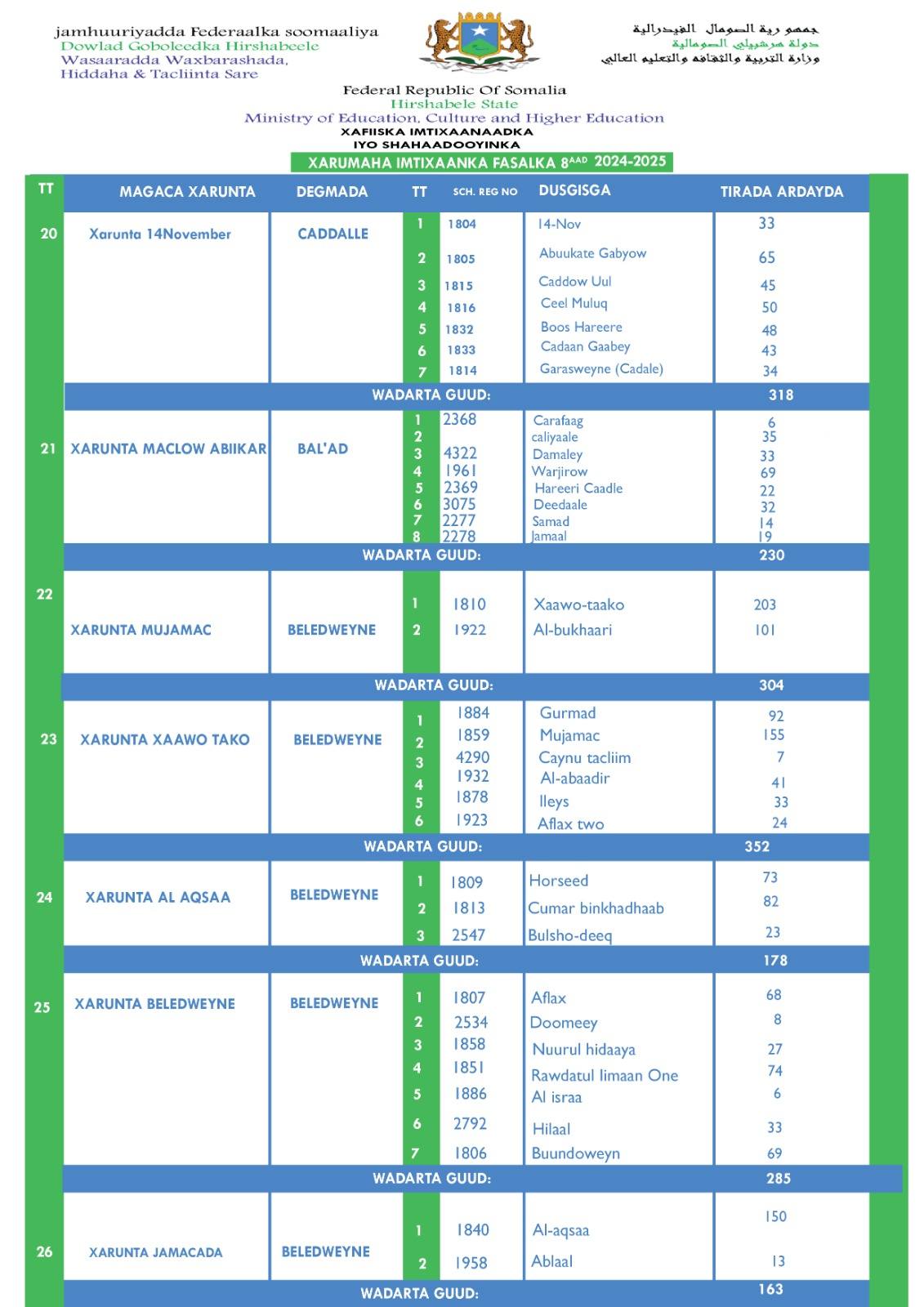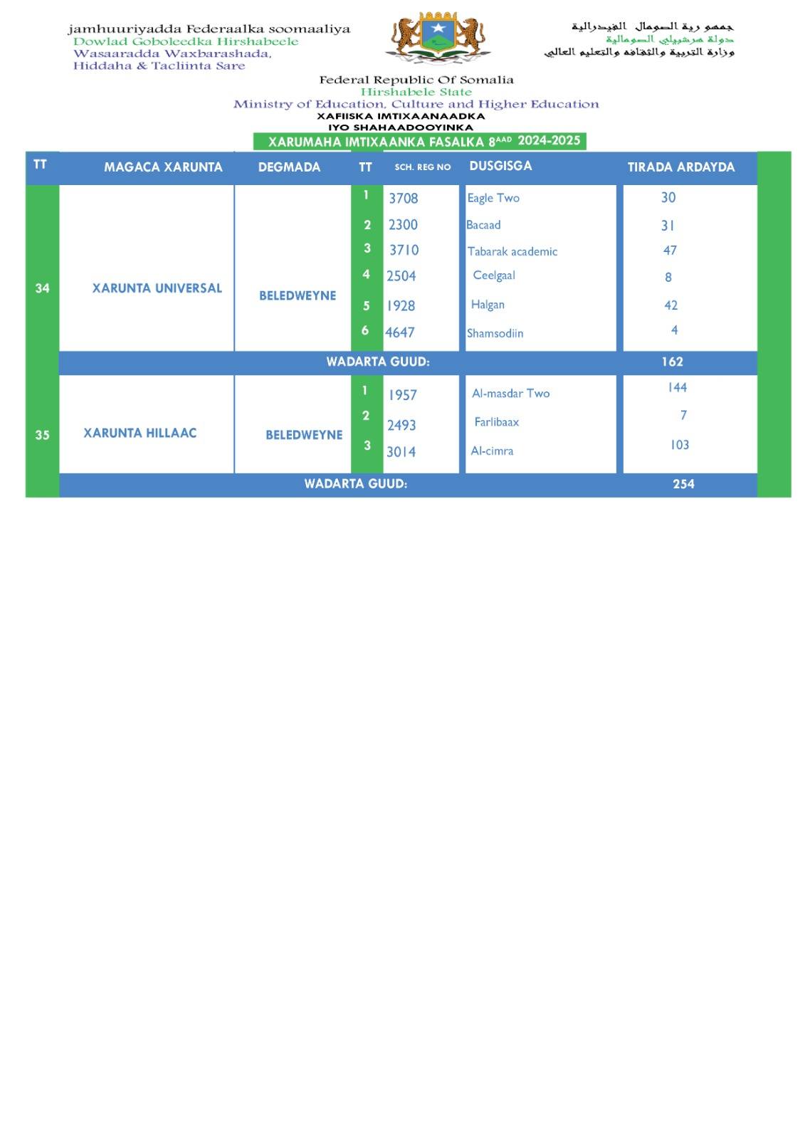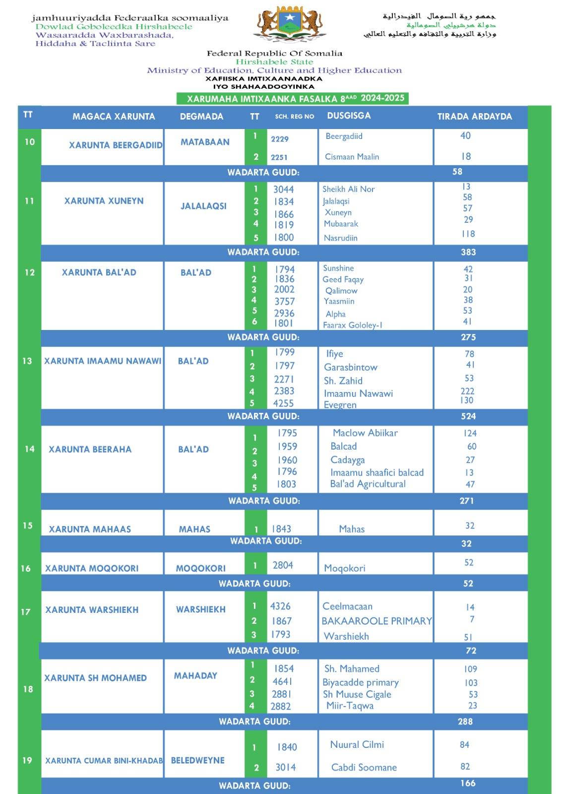Baledweyne ( Radio Beerlula )-Wasaaradda Waxbarashada, Hiddaha iyo Tacliinta Sare ee Dowladda Hirshabeelle ayaa si rasmi ah u shaacisay xarumaha rasmiga ah ee lagu galayo imtixaanka fasalka 8aad ee sanad dugsiyeedka 2024–2025.