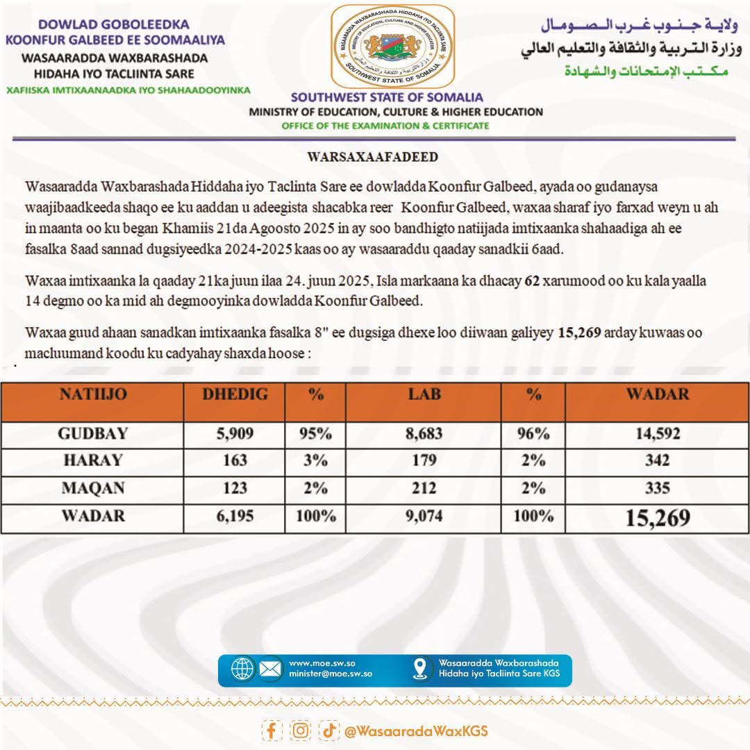 Baledweyne ( Radio Beerlula )-Wasaaradda Waxbarashada iyo Tacliinta Sare Dowlad goboleedka Koonfur Galbeed ayaa maanta shaacisay Imtixaan Ardayada Fasalka 8aad ee KGS sanad dugsiyeedka 2024-2025 iayada oo munsaabada lagu shaacinayey aay ka qeyb galeen mas’uuliyiin kamid ah Wasaaradda Waxbarashada iyo Tacliinta Sare Dowlad goboleedka Koonfur Galbeed macallimiin, waalidiin iyo marti sharaf kale.